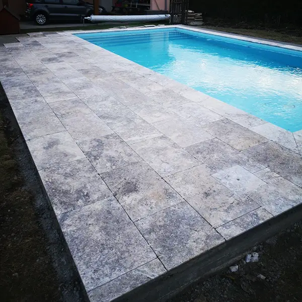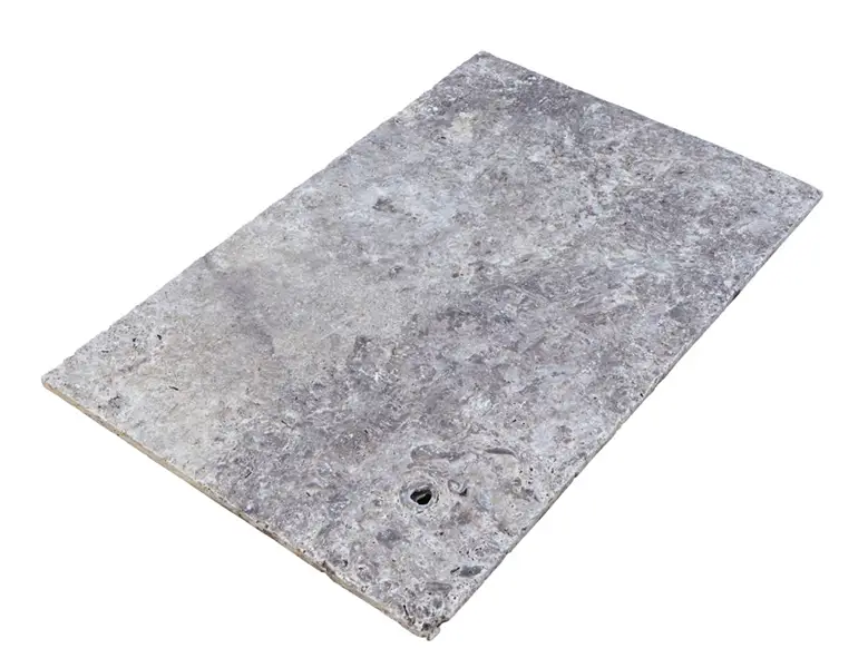 Le travertin silver gris (EN12670) est une roche sédimentaire carbonatée de couleur gris nuancé à fond clair pouvant avoir des reflets brun. Des nuances de couleurs et/ou de granulométrie peuvent exister entre les différents lots et même au sein du même lot. Il doit être soigneusement choisi en fonction de la destination prévue.